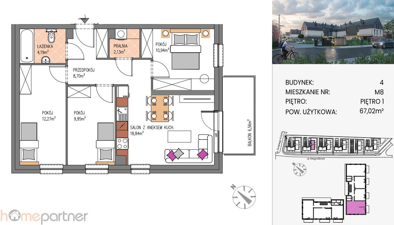 Na sprzedaż funkcjonalne mieszkanie 4 -pokojowe o powierzchni 67,02 m, z balkonem (6,56 m) zlokalizowane w kameralnej inwestycji w Siechnicach, tuż pod Wrocławiem.