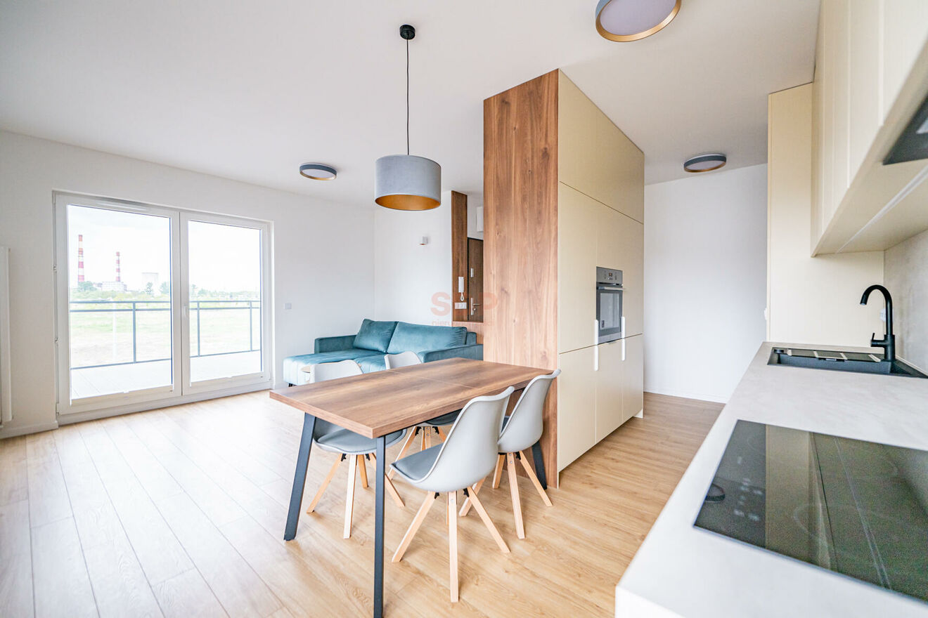 Kuchnia w zabudowie w pełni wyposażona w sprzęt AGD najlepszych marek (chłodziarko-zamrażarka, zmywarka, płyta indukcyjna, piekarnik elektryczny, pochłaniacz). Dużo miejsca do przechowywania - 3 duże szafy. Z salonu wyjście na przestronny taras. Z obu sypialni wyjście na balkon. W salonie duży , rozkładany stół, TV Led.