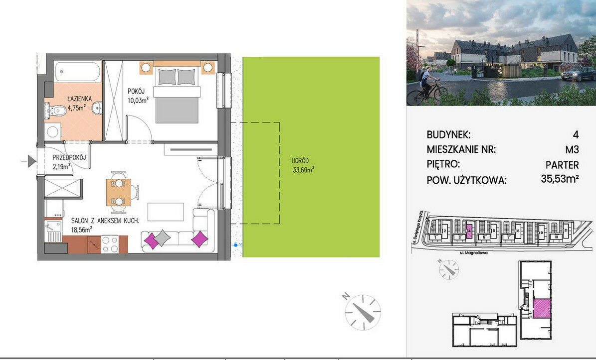Prezentowane mieszkanie ma powierzchnię 35,53m2 i znajduje się na parterze w 3 kondygnacyjnym budynku. Mieszkanie składa się z salonu z aneksem kuchennym o powierzchni 18,56 m2, z salonu wyjście na ogród o powierzchni 33,6m2. W mieszkaniu znajduje się dodatkowo sypialnia o powierzchni 10,03m2, przedpokój o powierzchni 2,19m2 oraz łazienka o powierzchni 4,75m2.