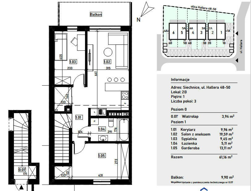 Prezentowane mieszkanie ma powierzchnię 61,16m2 i znajduje się na pierwszym piętrze w dwukondygnacyjnym budynku a jego główne cechy to- salon z aneksem kuchennym o powierzchni 19,59m2 z wyjściem na duży balkon o powierzchni 9,90m2, 2 sypialni o powierzchniach 13,11m2 i 9,45m2 , korytarz o powierzchni 9,96m2, wiatrołap o powierzchni 3,94m2 oraz łazienka o powierzchni 5,11m2.