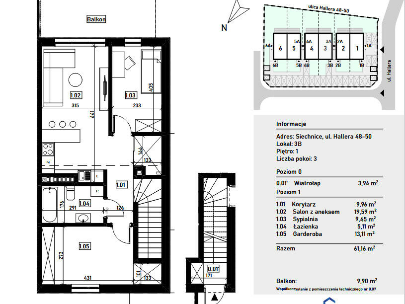 Wyjątkowa inwestycja, która oferuje swoim mieszkańcom nie tylko komfortowe mieszkanie, ale także wysoki standard życia. Położona w spokojnych Siechnicach, z dala od miejskiego zgiełku, zapewnia jednocześnie łatwy dostęp do wszelkich udogodnień. Dzięki przemyślanej architekturze i zastosowaniu wysokiej jakości materiałów mieszkania są nie tylko piękne, ale również funkcjonalne. W otoczeniu znajduje się niska zabudowa głównie domów jednorodzinnych, a tereny otaczające inwestycję sprzyjają spacerowiczom, uprawianiu sportu oraz wszelkiej rekreacji na łonie natury, wzdłuż rzeki i tuż przy zbiorniku wodnym – znanej w okolicy Błękitnej Lagunie.Prezentowane mieszkanie ma powierzchnię 61,16m2 i znajduje się na pierwszym piętrze w dwukondygnacyjnym budynku a jego główne cechy to- salon z aneksem kuchennym o powierzchni 19,59m2 z wyjściem na duży balkon o powierzchni 9,90m2, 2 sypialni o powierzchniach 13,11m2 i 9,45m2 , korytarz o powierzchni 9,96m2, wiatrołap o powierzchni 3,94m2 oraz łazienka o powierzchni 5,11m2.