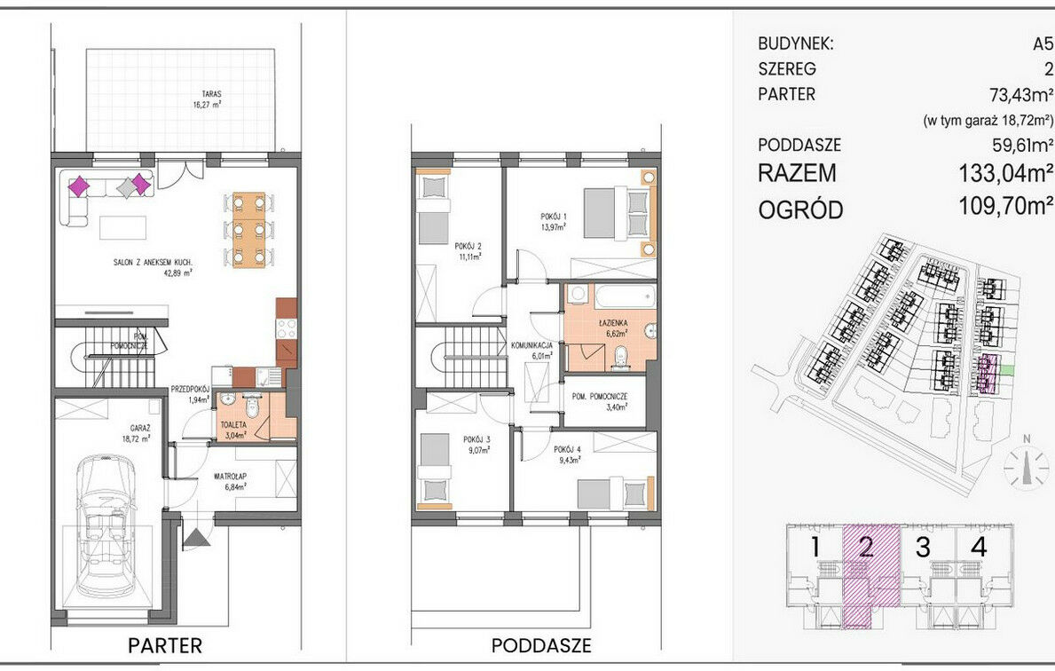 Wybudowane zostaną 22 budynki, 1-pietrowe, w zabudowie bliźniaczej o powierzchni ok.130 m2 wraz z ogródkiem, garażem i miejscami postojowymi.