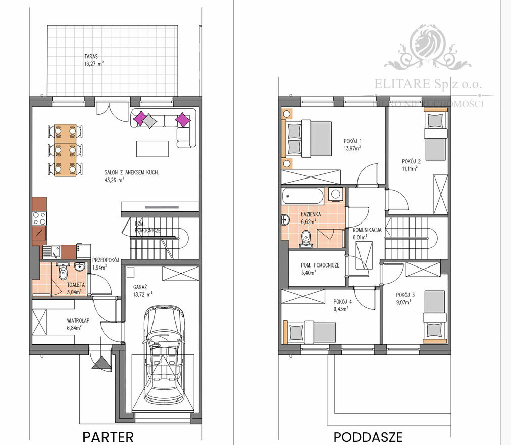Zapraszam do zakupu pięknych domów w zabudowie szeregowej z ogrodami. Otoczenie malowniczych terenów zielonych jest niewątpliwym atutem tego miejsca, docenianym przez osoby chcące mieć za „sąsiadów” ciszę i spokój. Własność działki z udziałem w drodze, dodatkowo z przepięknym parkiem z wyłącznym udziałem dla mieszkańców. Bliskość Wrocławia, a zarazem cisza i zieleń- sprawiają, że jest to odpowiednie miejsce zarówno dla rodzin z dziećmi jak i osób ceniących życie z dala od miejskiego zgiełku oraz okolicę z dużym potencjałem rozwoju. Komfort życia to lokalizacja, odpowiedni metraż, idealny rozkład sprawią, że pokochasz to miejsce. Wybudowane zostaną 22 budynki, 1-pietrowe, w zabudowie bliźniaczej o powierzchni ok.130 m2 wraz z ogródkiem, garażem i miejscami postojowymi.Prezentowany dom ma powierzchnię 133,04 m2 na działce 202,21m2. Dom na parterze ma zaprojektowany duży przestronny salon z aneksem kuchennym o powierzchni 43,26m2 z wyjściem na ogród o powierzchni 69,7m2. Na parterze znajduje się również toaleta o powierzchni 3,04m oraz wiatrołap o powierzchni 6,04m2. W bryle budynku został zaplanowany również garaż o powierzchni 18,72m2. Na piętrze znajdują się cztery sypialnie o powierzchniach 13,97m2 i 11,1m2, 9,43m2, 9,07m2 oraz druga duża łazienka o powierzchni 6,62m2, na tym poziomie mamy też pomieszczenie pomocnicze idealne do przechowywania.